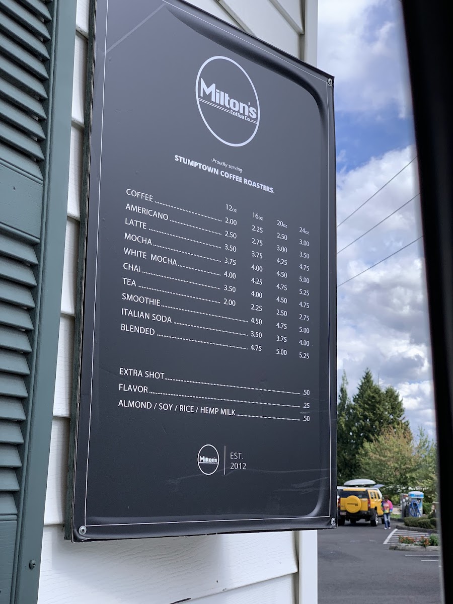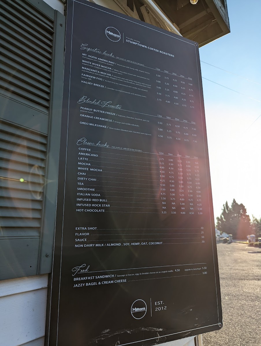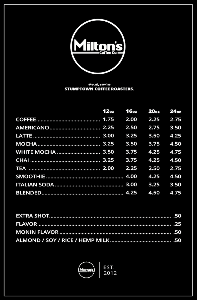 Welcome to Milton's Coffee Co., a charming local gem nestled in Fairview, Oregon. Known for its warm atmosphere and friendly baristas, Milton's offers an impressive array of classic drinks, including rich Americanos, creamy Lattes, and enticing Dirty Chais. For something refreshing, try their Italian Sodas or vibrant Smoothies.